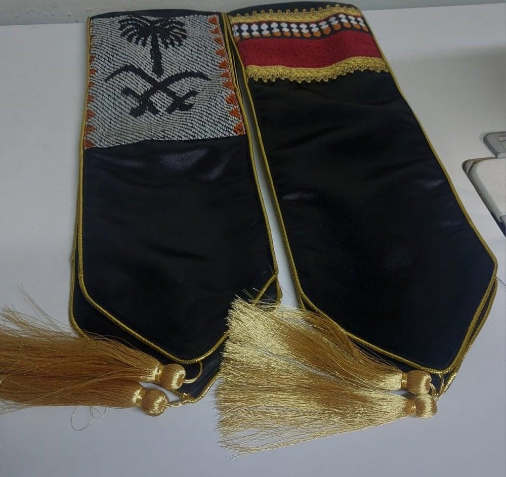 يعكس الوشاح جمال التراث السعودي من خلال نقوش السدو التراثية وشعار يوم التأسيس، ما يجعله قطعة فنية تمثل الفخر الوطني.